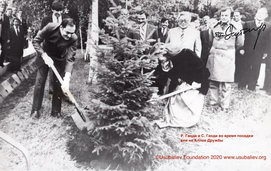 В добрую память о пребывании в Киргизской ССР Раджив Ганди посадил вечнозеленую тянь-шаньскую ель на аллее Дружбы народов. На табличке выгравировано на киргизском и русском языках: «Ель тянь-шаньская. Посажена премьер-министром Республики Индии Радживом Ганди. Май. 1985 г.”.