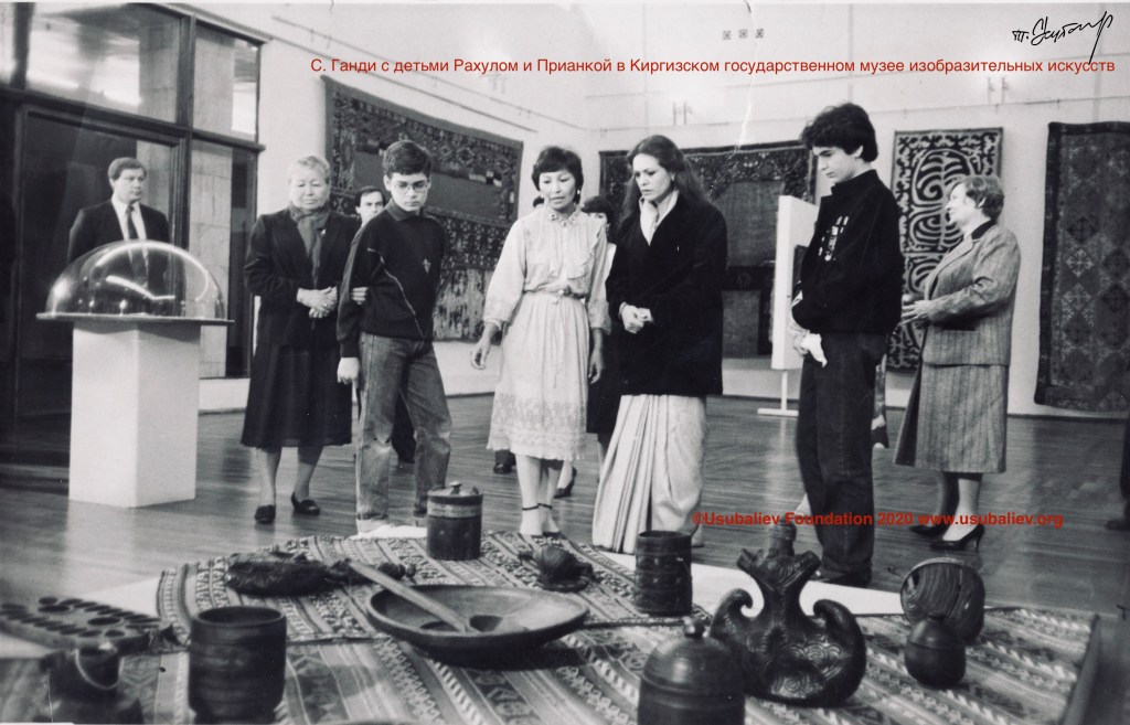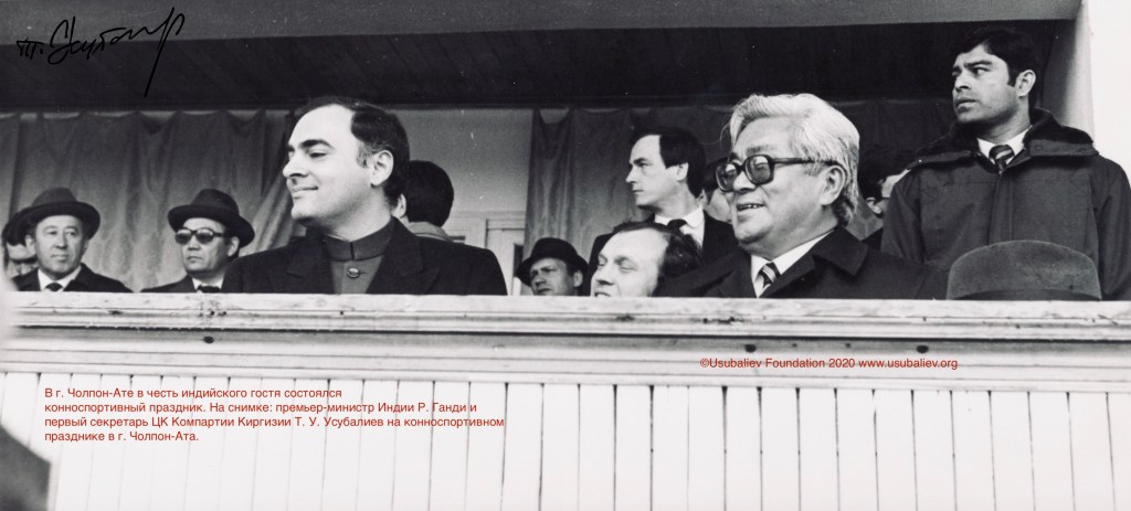 Утром 26 мая, после завтрака, перед отлетом из города Чолпон-Ата главе индийского правительства Радживу Ганди мы надели киргизский национальный халат, сшитый для него из темно-синего бархата с национальным орнаментом, и головной убор — ак-калпак, как памятный сувенир. Он с удовольствием оделся в эту национальную одежду и в ней же садился во Фрунзе в свой самолет, тем самым выказывая свое глубокое уважение к киргизскому народу, к его традициям.