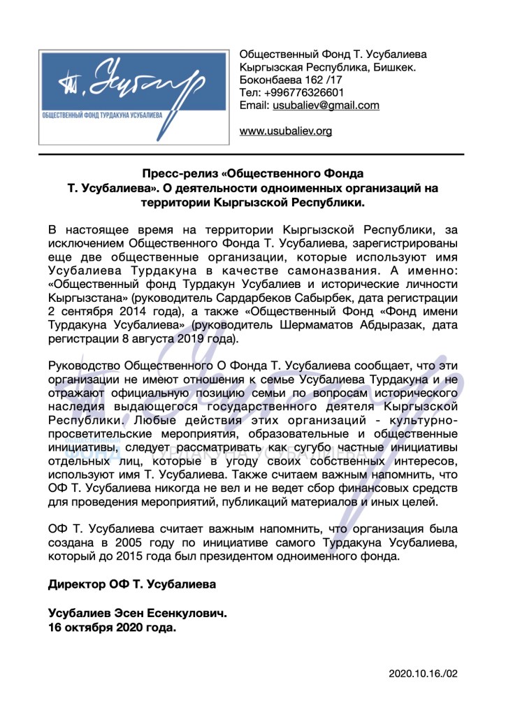 Пресс-релиз Общественного Фонда Т. Усубалиева. By usubalievfoundation on 16.10.2020 • ( 0 ) О деятельности одноименных организаций на территории Кыргызской Республики. Поделиться ссылкой: Нажмите, чтобы поделиться в X (Открывается в новом окне) X Нажмите, чтобы открыть на Facebook (Открывается в новом окне) Facebook Нравится Загрузка...‹ Усубалиев Т.У. Фрунзе — столица советского Киргизстана. (Краткий исторический очерк)Турдакун Усубалиев: «Север — Юг… Это понятие должно быть чисто географическим, но никак не политическим». ›Рубрики:НовостиМетки: избранное
